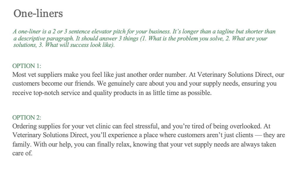 I also provided Dave and Morgan with two, one-liner options that they can use across all their marketing material. Even though this likely won’t make it into their website copy, it’s a good idea for businesses to have readily available one-liners.
